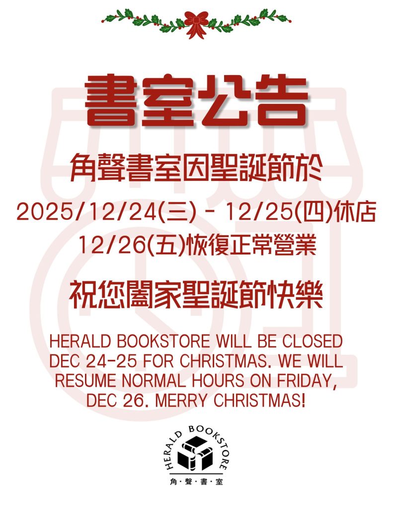 📢 角聲書室將於 12/24-12/25休店,12/26(五)恢復正常營業。